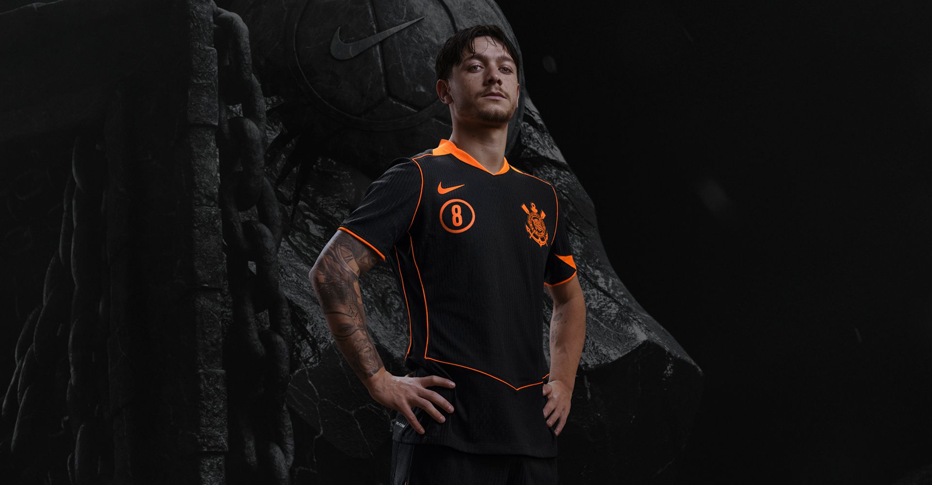 Esta terceira camisa do Corinthians é predominantemente preta com detalhes em laranja, combinando tradição e modernidade para os torcedores que buscam um visual estiloso e cheio de atitude.